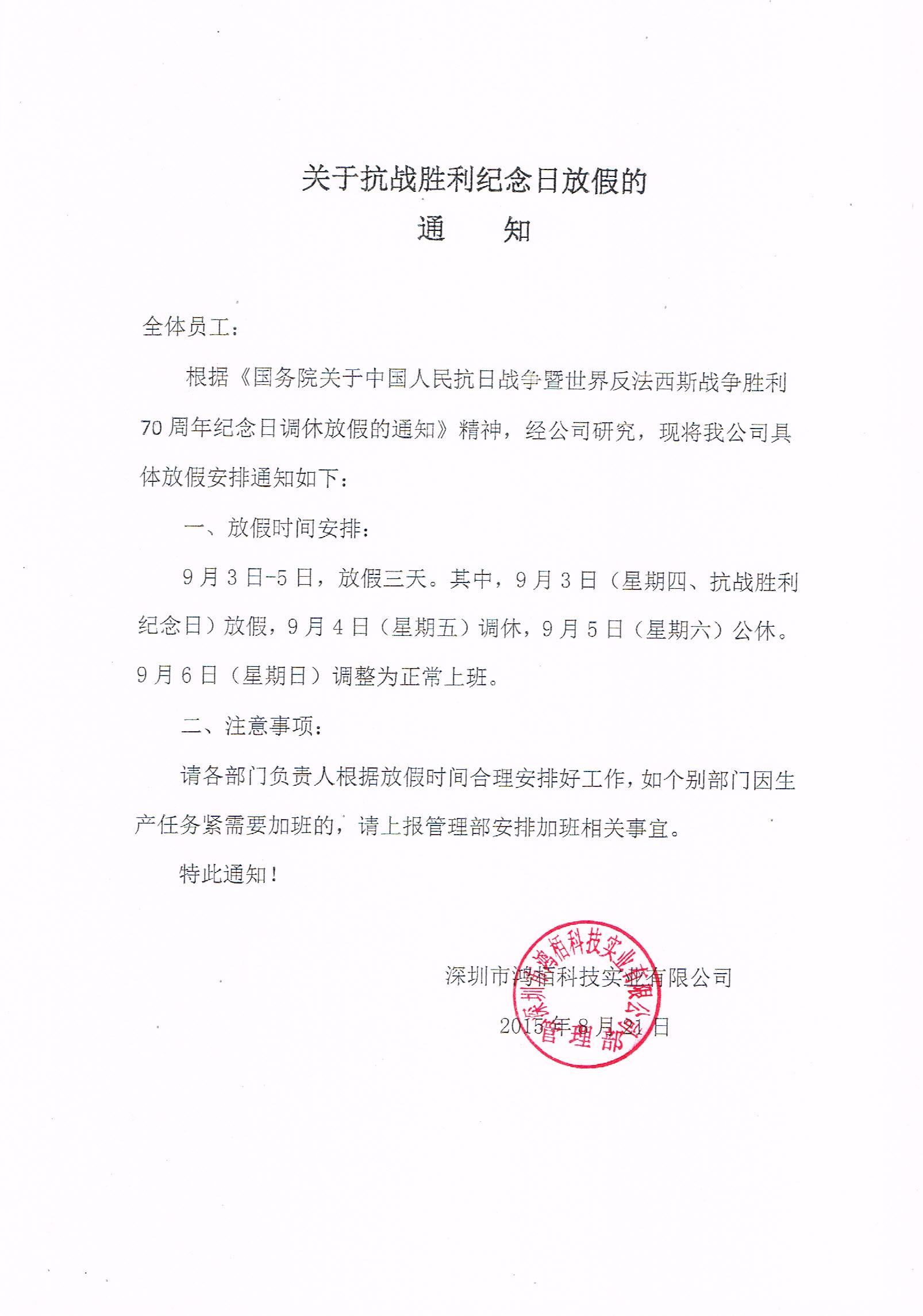 鴻栢科技關(guān)于抗戰(zhàn)勝利紀(jì)念日放假通知