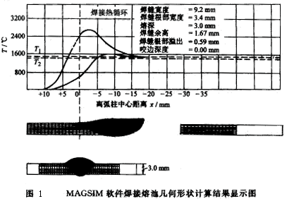 (1)焊接溫度場(chǎng)的數(shù)值模擬 溫度場(chǎng)的模擬是對(duì)焊接應(yīng)力應(yīng)變場(chǎng)及焊接過(guò)程其他現(xiàn)象進(jìn)行模擬的基礎(chǔ),同時(shí)通過(guò)溫度場(chǎng)的模擬還可以預(yù)測(cè)焊接熔池形狀,滿足設(shè)計(jì)要求,防止諸如未熄透、燒穿、咬邊、熔池等缺陷的產(chǎn)生。比如德國(guó)Aachen大學(xué)焊接研究所(ISV)對(duì)氣保焊熔地縮狀的模擬就是在對(duì)焊接溫度場(chǎng)進(jìn)行計(jì)算的基礎(chǔ)上,對(duì)氣保焊過(guò)程中電弧的電磁現(xiàn)象、熱力學(xué)和流體動(dòng)力學(xué)等的作用分別進(jìn)行分析,然后加以綜合以求得如焊縫的幾何形狀和尺寸的實(shí)例。德國(guó)ISV在研究工作的基礎(chǔ)上開發(fā)了MAGSIM軟件,其主要功能就是根據(jù)焊件種類和厚度,坡口型式和焊接條件計(jì)算氣體保護(hù)焊時(shí)焊縫中各點(diǎn)的熱循環(huán)和熔池的幾何形狀。這一軟件還可以依據(jù)求得的焊縫幾何形狀判斷是否發(fā)生了未焊透或燒穿,判斷焊縫頂部和根部的寬度和余高、熔深或咬邊是否滿足質(zhì)量要求(見(jiàn)圖1)。MAGSIM同時(shí)可用作優(yōu)化焊接工藝參數(shù)的工具。該軟件目前已經(jīng)商品化,其適用范圍還在擴(kuò)大,功能也將不斷增加。