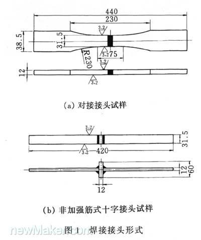 (1)焊接條件及方法 研究中采用圖1所示對接和非加強筋式十字角接兩種典型的焊接接頭形式。